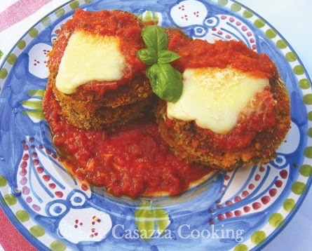 The eggplants are so crispy and are baked in the oven. I made a marinara sauce with canned cherry tomatoes and sautéed some Swiss chard and that was spooned under the marinara sauce. I peel the eggplant leaving stripes; otherwise, the peel can be quite chewy.