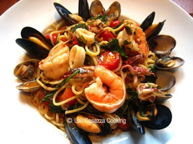 The Amalfi Coast is a stretch of coastline on the Sorrentine Peninsula in the Province of Salerno in southern Italy. Very ripe little tomatoes called pendolini (little hanging ones) are used in making fresh sauces. This pasta dish reminds me of the one I had in the small town of Praiano at the ristorante “Il Pirata” sitting above the emerald water of the Marina di Praia. This is very important: read through the recipe and have everything chopped and set aside, ready to add to the skillet. If you love seafood with pasta, this recipe is for you! You can choose any type of shellfish that you like...frutti di mare del giorno.